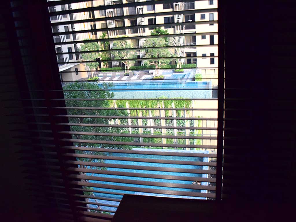Room detail : Very new on 9th floor, 37sqm. Conner pool view and BTS view with 1/Bedroom, 1/Bathroom, Living room, Balcony, Kitchen, 1/Car park.