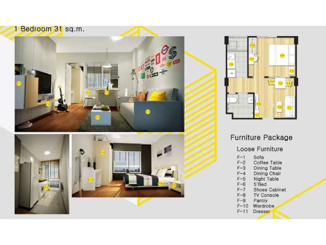 เป็นห้องPromotion Build in furniture เช่นตู้เส้อผ้า โต๊ะเครื่องแป้ง อ่างล้างหน้า ชั้นวางทีวี เตียงนอน เค้าเตอร์ครัว โต๊ะกินข้าว แบ่งแยกโซนเป็นสัดส่วน เฟอร์นิเจอร์ครบ(ยกเว้นเครื่องใช้ไฟฟ้า)