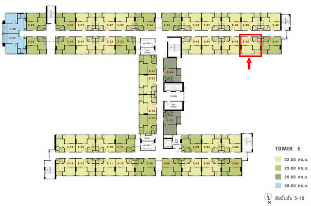 ขนาด 22.84 ตรม. 1ห้องนอน1น้ำห้อง ตึก E ชั้น 11 อยู่ด้านใน