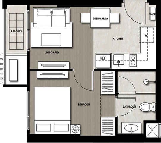 ห้องขนาด 33 ตรม. 1 ห้องนอน 1 ห้องน้ำ 1 ห้องนั่งเล่น