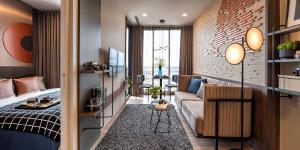 ให้เช่าห้องตกแต่งสวย ห้องนั่งเล่นเฟอร์และบิ้วอินครบ วิวสระว่ายน้ำ คอนโด Oka haus