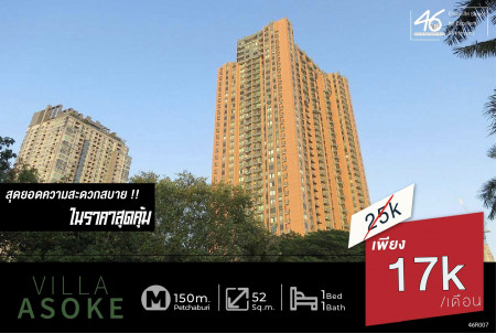 ให้เช่า คอนโด Villa อโศก 52 ตรม. Fully Furnished ห่างจาก MRT เพชรบุรี เพียง 200 เมตร