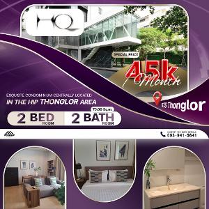 Condo HQ Thonglor 2 ห้องนอน 2 ห้องน้ำ เฟอร์นิเจอร์ครบ เช่าราคา 45,000 บาท