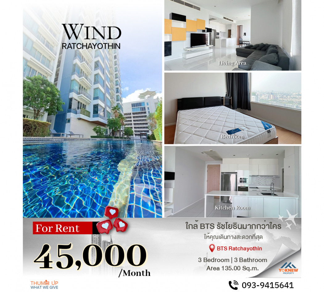 ให้เช่าด่วน Wind Ratchayothin 3 ห้องนอน 3 ห้องน้ำ ห้องใหญ่ใกล้ BTS รัชโยธิน วิวตึกช้าง เช่าราคาดี
