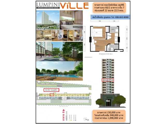 ขายดาวน์ LPN 60-2 อาคาร B ชั้น 7 ห้องเลขที่ 22 ขนาด 22.5 ตร.ม
