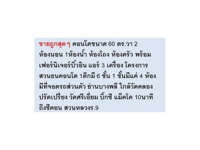 คอนโดแถวซีคอนสแคว 2 นอน 1 น้ำ 1 นั่งเล่น 1 ครัว + เฟอร์ รายละเอียดเพิ่มเติมดูในรูปภาพครับ พิเศษสุดครับ ราคา 1.42 ล้านบาท(ราคาต่อรองได้ครับ) ฟรีค่าโอน สนใจดูโครงการและชมภายในห้องได้ครับ ติดต่อสอบถามได้ครับ ID LINE pilot_ok