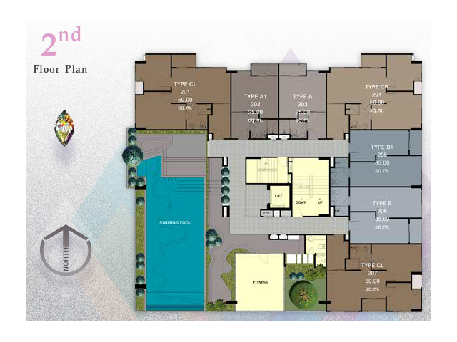 ขนาดห้อง 35 ตร.ม. 1 ห้องนอน 1 ห้องน้ำ 1 ห้องครัว +ห้องนั่งเล่น ชั้น 2 อยู่ทิศตะวันออก วิวหน้าห้องเป็นสวน และสระว่ายน้ำ +ฟิตเน็ต
